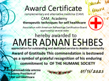 حاصل على شهادات معتمدة في العلاج الذاتي من أكاديمية كام العالمية التابعة لمجلس الشهادات العليا الأمريكي و المصادق عليه من قبل منظمة الصحة العالمية
