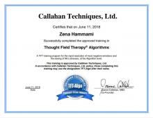 - معالجة معتمدة من مؤسسة كالاهان الأمريكية للعلاج بتقنية النقر على مسارات الطاقة (TFT)