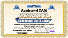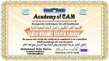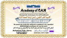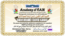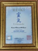 حاصل على شهادة الريكي المستوى الثالث( REIKI MASTER ) والتي تعتمد على وضع اليدين على أماكن محددة في الجسد لتنشيط او تهدئة العضو المريض