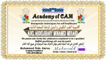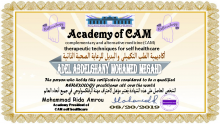 اختصاصي علاج ذاتي حاصل على شهادات معتمدة من أكادمية الطب التكميلي والبديل للرعاية الصحية الذاتية والمعتمدة من مجلس الشهادات العليا الأمريكي في اطار الطب التكميلي و البديل تحت رعاية منظمة الصحة العالمية اكاديمية