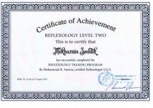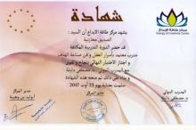 شهادة في العلاج بالرفلكسولوجي من البورد الأمريكي مع المدرب الدولي والأول في تخصصه عربيا الأستاذ محمد رضى عمرو من لبنان.